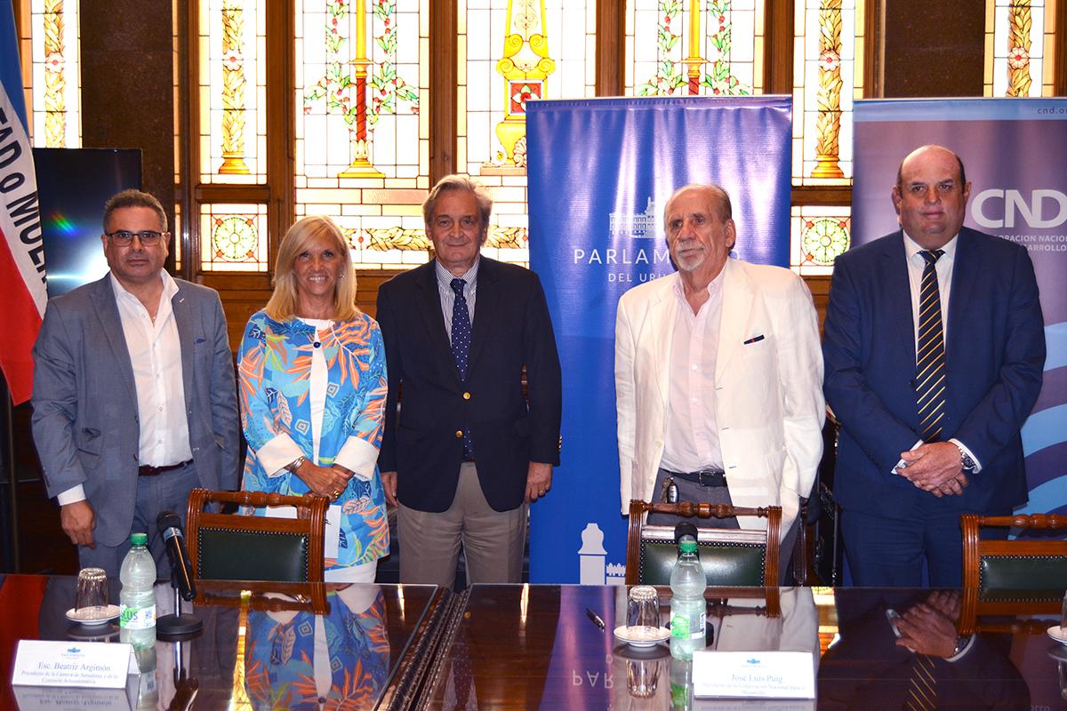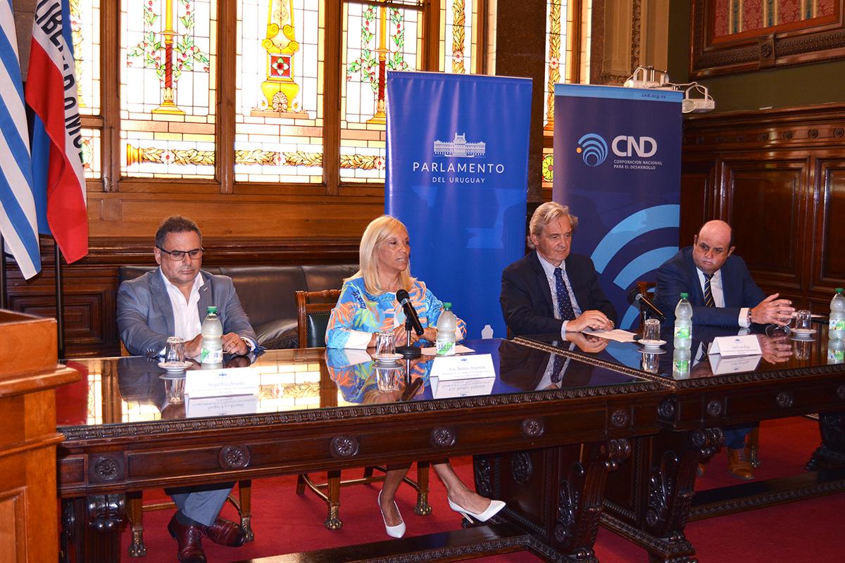 Por el Palacio Legislativo firmaron el convenio: la Presidenta de la Asamblea General y de la Comisión Administrativa, escribana Beatriz Argimón; el Secretario de la Comisión Administrativa, Fernando Perdomo y por la Corporación Nacional para el Desarrollo: el Presidente del organismo, economista José Luis Puig y el Vicepresidente Angel Fachinetti.