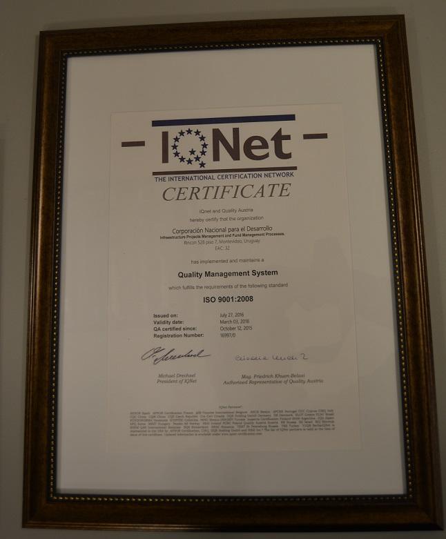 Un certificado de LSQA S.A. y uno de Quality Austria que confirman la aplicación y el desarrollo continuo de un efectivo Sistema de Gestión de la Calidad según los requisitos de la norma ISO 9001:2008 en el ámbito de aplicación de los Procesos de Gestión de Proyectos de Infraestructura y de Administración de Fondos.