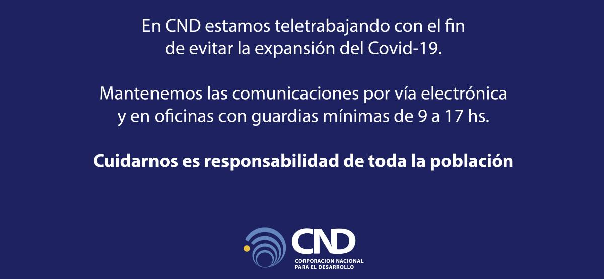 Jue, 19/03/2020 - 12:00 covid-19 Comunicado (marzo de 2020) En CND estamos teletrabajando con el fin de evitar la expansión del Covid-19. Mantenemos las comunicaciones por vía electrónica y en oficinas con guardias mínimas de de 9 a 17 hs. Cuidarnos es responsabilidad de toda la población.